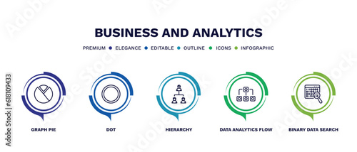 set of business and analytics thin line icons. business and analytics outline icons with infographic template. linear icons such as graph pie, dot, hierarchy, data analytics flow, binary data search
