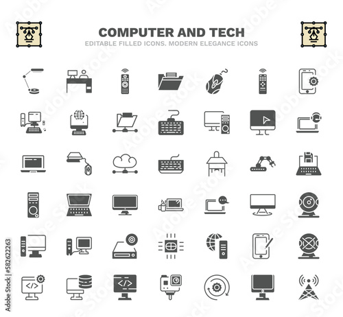 set of computer and tech filled icons. computer and tech glyph icons such as study lamp, tv controller, computer mouse device, monitor, classroom keyboard, open laptop on, webcamera, internet