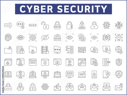 Set of Cyber Attack Icons line style.Contains such Icons as cyber security, bug, protection, virus, hacking, bug, antivirus, cyber lock, network, spam, spy And Other Elements.