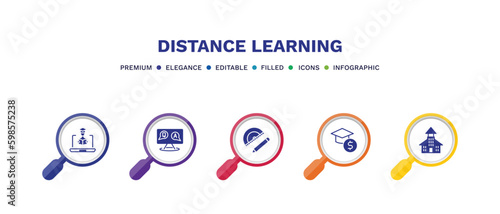 set of distance learning filled icons. distance learning filled icons with infographic template. flat icons such as online education, qa, study tools, business education, daycare center vector.
