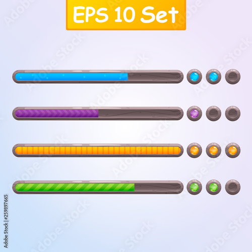 Set of four game resource bar in stone frame. Cartoon style gui elements for mobile game. Vector design template for game, web development.