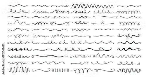 Set of hand-drawn doodle lines and wavy underline elements. Decorative scribble dividers, borders, and irregular abstract shapes for graphic design projects and creative content