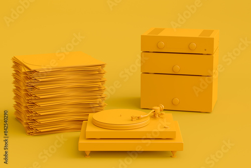 Set of Hi-fi speakers and DJ turntable with vinyl LP record on heap of covers