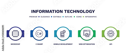 set of information technology thin line icons. information technology outline icons with infographic template. linear icons such as microchip, c sharp, mobile development, web optimization, api