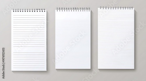 Set of lined and patterned notebook paper sheets with grid texture for school or work notes, isolated on a grey background with copy space