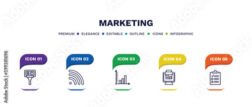 set of marketing thin line icons. marketing outline icons with infographic template. linear icons such as bid, rss, diagrams, web package, checklist vector.