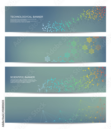 Set of modern scientific banners. Molecule structure DNA and neurons. Abstract background. Medicine, science, technology, business, website templates. Scalable vector graphics.