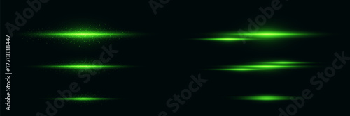 Set of neon green horizontal lines. Laser effect of flash and light.