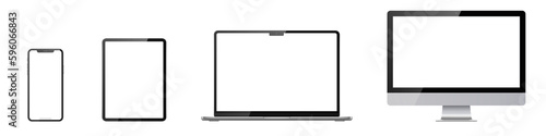 Set of phone, tablet, laptop, monitor on transparent background with transparent screen. Png illustration.