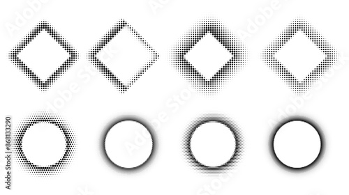 Set of round square halftone frames. Dotted abstract shapes with empty space for text.