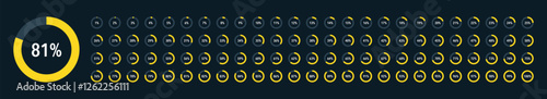 Set of round yellow infographic pie charts, segment of circle icons 0% - 100%, simple flat design loading data interface elements app button ui ux web, vector isolated on dark background