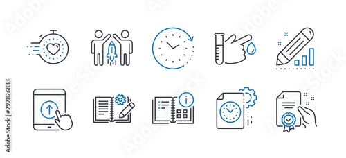 Set of Science icons, such as Partnership, Swipe up, Blood donation, Engineering documentation, Timer, Project deadline, Instruction info, Time change, Edit statistics, Certificate. Vector