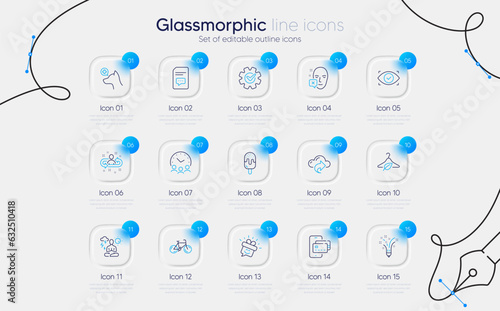 Set of Smile, Cogwheel and Ice cream line icons for web app. Comments, Biometric eye, Face declined icons. Recruitment, Slow fashion, Bicycle signs. Phone pay, Veterinary clinic, Yoga. Vector