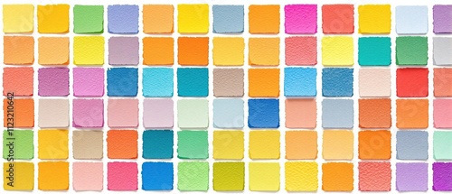 Set of square paper scraps with different colors and textures arranged in a grid pattern on white background, colored paper shapes, grid paper design