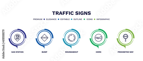 set of traffic signs thin line icons. traffic signs outline icons with infographic template. linear icons such as gas station, bump, roundabout, horn, prohibited way vector.