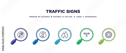 set of traffic signs thin line icons. traffic signs outline icons with infographic template. linear icons such as no plug, no straight, fire, t junction, hospital vector.