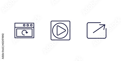set of user interface thin line icons. user interface outline icons included reload webpage, play video button, export arrow vector.
