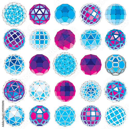 Set of vector dimensional wireframe low poly objects, spherical facet shapes with grid. Technology 3d mesh elements collection can be used as design forms in engineering.
