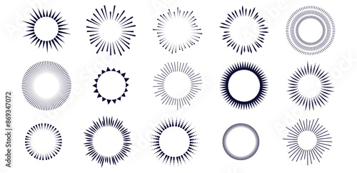 Set of vintage sunburst line elements. Radial sunset beams. Vector illustration. Bursting sun rays, fireworks. Concentric circular patterns isolated on a white background