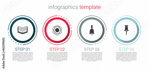 Set Open book, Atom, Ringing bell and Push pin. Business infographic template. Vector