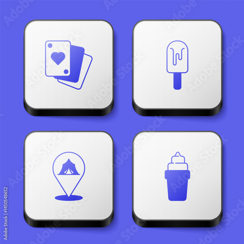 Set Playing cards, Ice cream, Circus tent and waffle icon. White square button. Vector