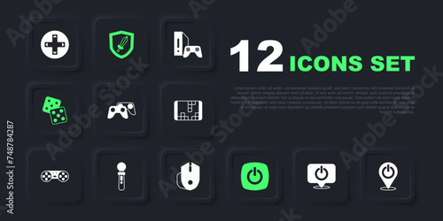 Set Power button, Game controller or joystick, dice, VR game, Sword for and Computer mouse icon. Vector