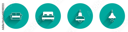 Set Sofa, Big bed, Lamp hanging and icon with long shadow. Vector