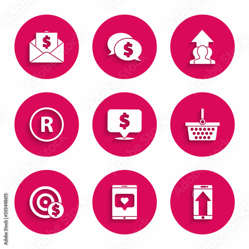 Set Speech bubble with dollar, Mobile phone and like heart, Smartphone, mobile, Shopping basket, Target symbol, Registered Trademark, Growth chart progress people crowd and Envelope coin icon. Vector