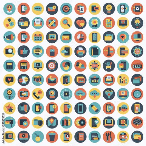 Set vector icons with elements for mobile concepts and web apps. Business and marketing, programming, data management, internet connection, social network, computing, information. Vector