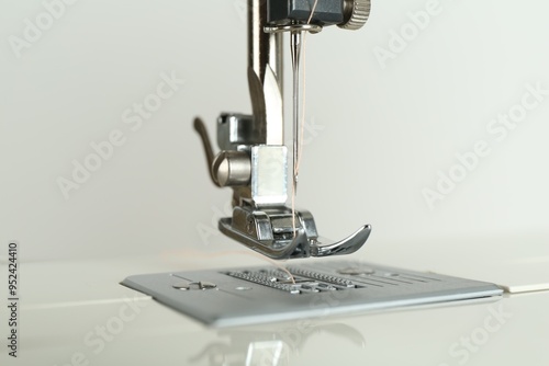 Sewing machine with beige thread on light background, closeup
