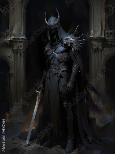 Shadowy Dark Fantasy Warrior with Sword - Dark Magic Illustration