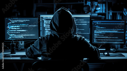 Shadowy figure of a hacker coding on multiple computer screens in a dark room.