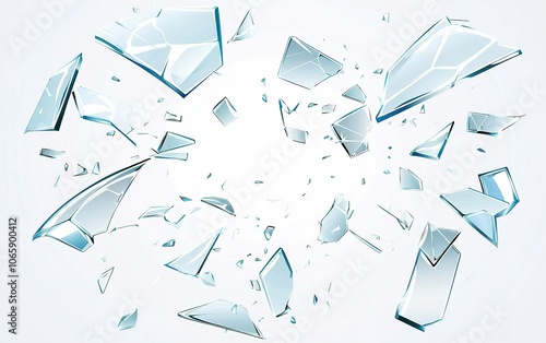 Shattered glass pieces scattering in various directions against a light background, creating a dynamic and chaotic visual effect