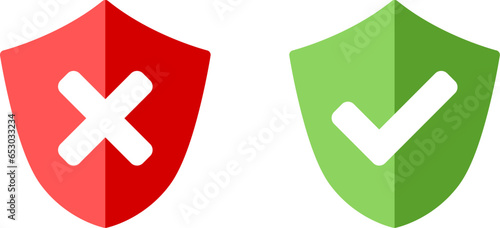 Shield Green and Red Safe and Unsafe Security Icon Set with Checkmark and X Cross Signs with Shadow Effect. Vector Image.