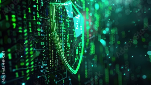 Shield icon, green binary code, network connections, side view, emphasizes secure networking, futuristic tone, vivid color scheme