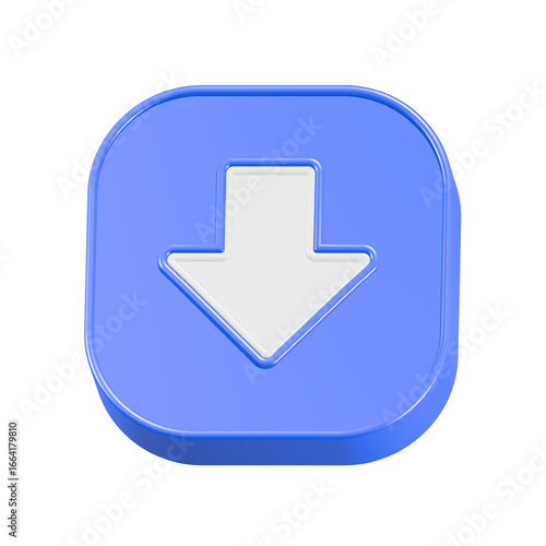 Shiny download icon on a glossy blue button for web design 3d rendering