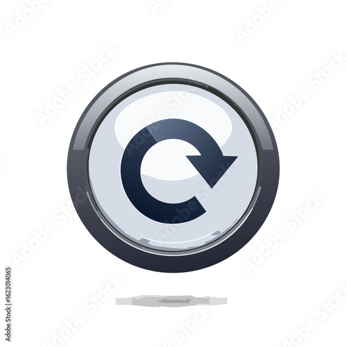 Shiny metal round button with circular arrow indicating refresh, reload, or repeat functionality.
