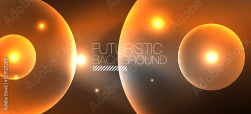 Shiny neon geometric abstract background. Glowing lights on round shapes, triangles and circles. Wallpaper for concept of AI technology, blockchain, communication, 5G, science, business