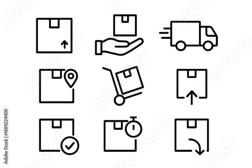 Shipping and delivery line icon set. Logistics and e-commerce vector pictograms. Package tracking, order fulfillment, transport, and freight symbols for web and apps.
