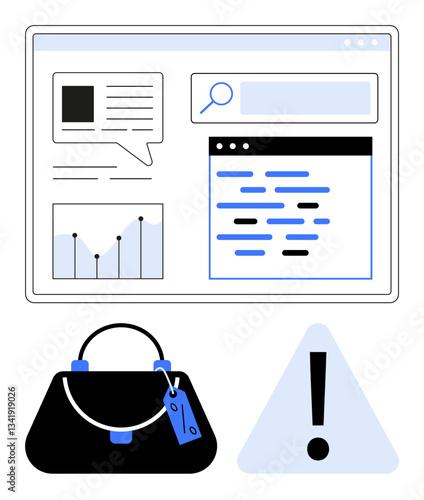 Shopping bag with price tag, browser data visualization, code snippets, and alert triangle. Ideal for digital retail, e-commerce, data, analytics, online security coding decision-making flat