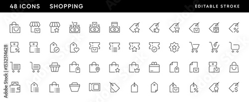 Shopping icon collection. Retail icon set. Purchase, store, shopping bag, wallet, sale, invoice, price tag, marketplace, gift and more. Editable stroke. Pixel Perfect. Grid base 32 x 32.