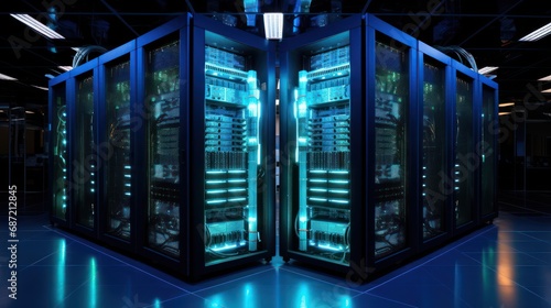 Shot of Data Center With Multiple Rows of Fully Operational Server Racks. Modern Telecommunications, Cloud Computing, Artificial Intelligence, Database, Super Computer Technology Concept