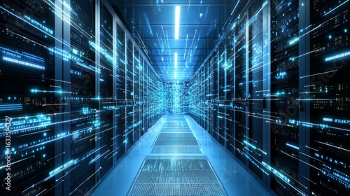 Shot of modern data center interior featuring multiple rows of fully operational server racks, advanced cloud computing infrastructure, artificial intelligence processing, database management, and sup