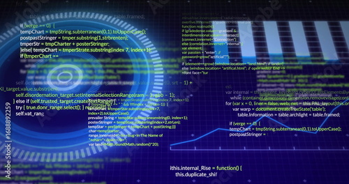 Showing circular HUD overlaying code editor console output on glowing screen grid with particles