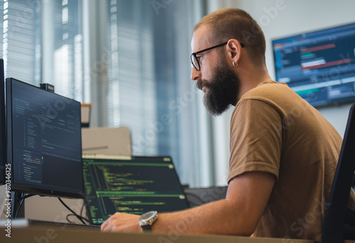 Side view of a Black software developer engaged with a computer in a cutting-edge office, concentrating on programming and data systems.