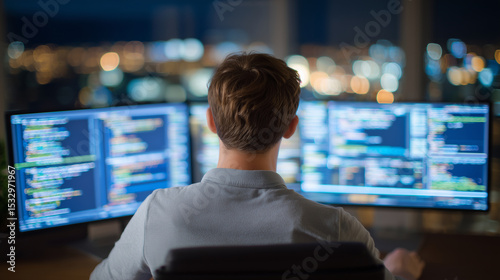 Side view of a software developer in ergonomic chair coding intensely, multi-monitor workstation showing layered scripts, source code, and real-time system analytics