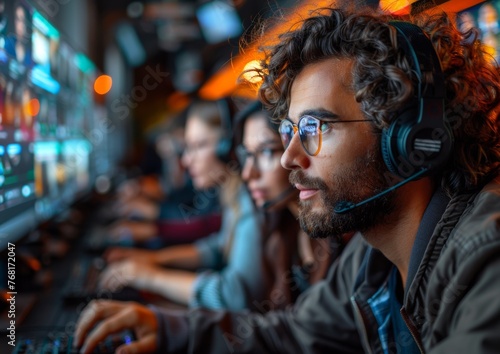 Side view of people working in mission control center and managing the flight.