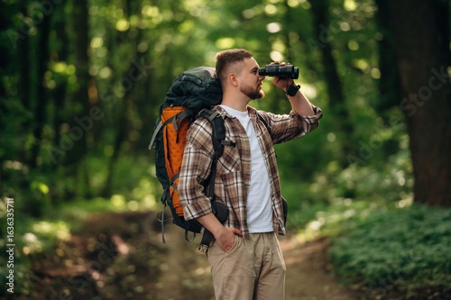 Side view, standing, holding binoculars. Male tourist is with backpack in the forest