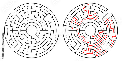 Side-by-side round labyrinths: unsolved and solved versions. Red path highlights correct route. Ideal for problem-solving illustrations or game design.