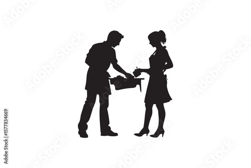 Silhouette of a Man and Woman Cooking Together Preparing Food Wearing Aprons Isolated on White Background Representing Teamwork and Culinary Arts